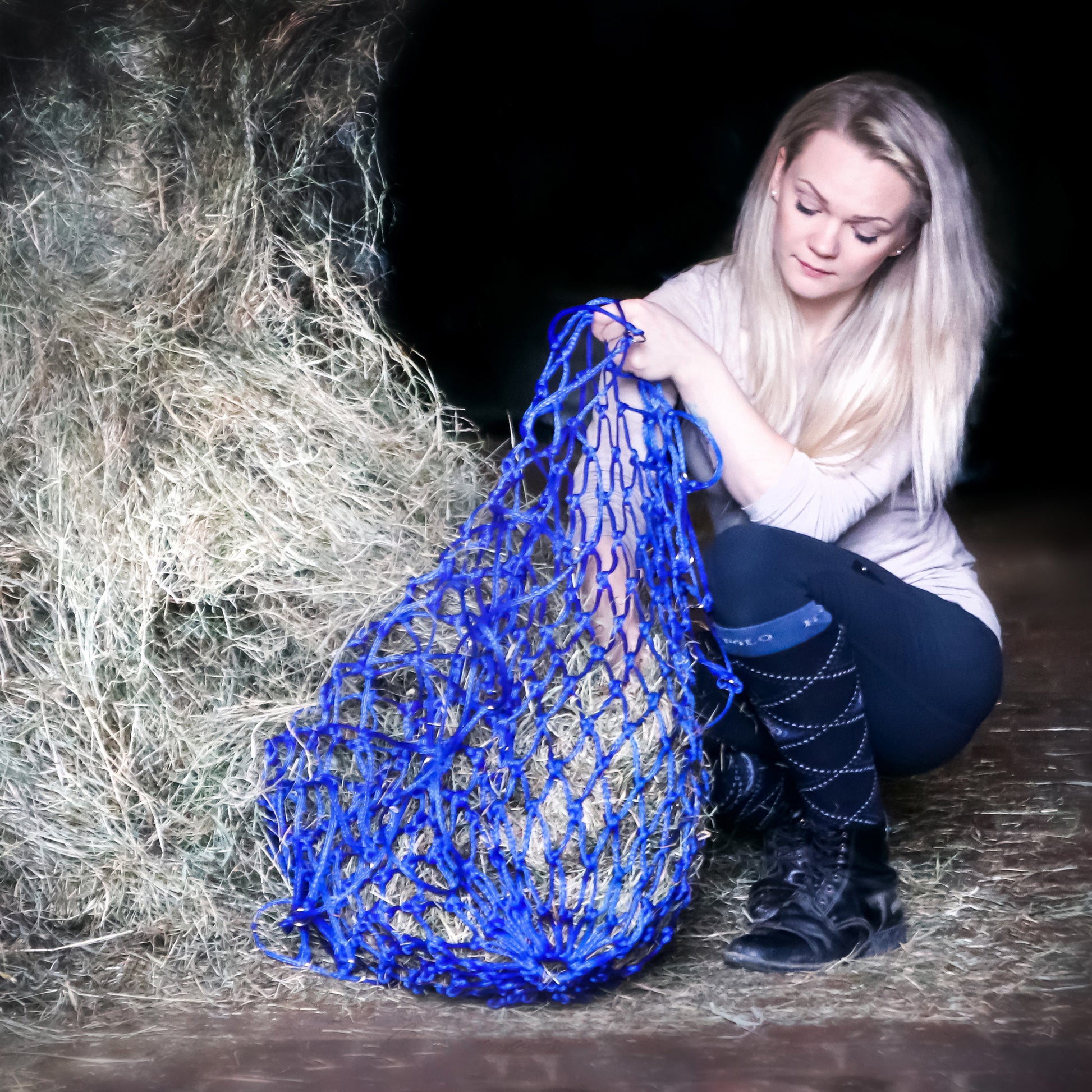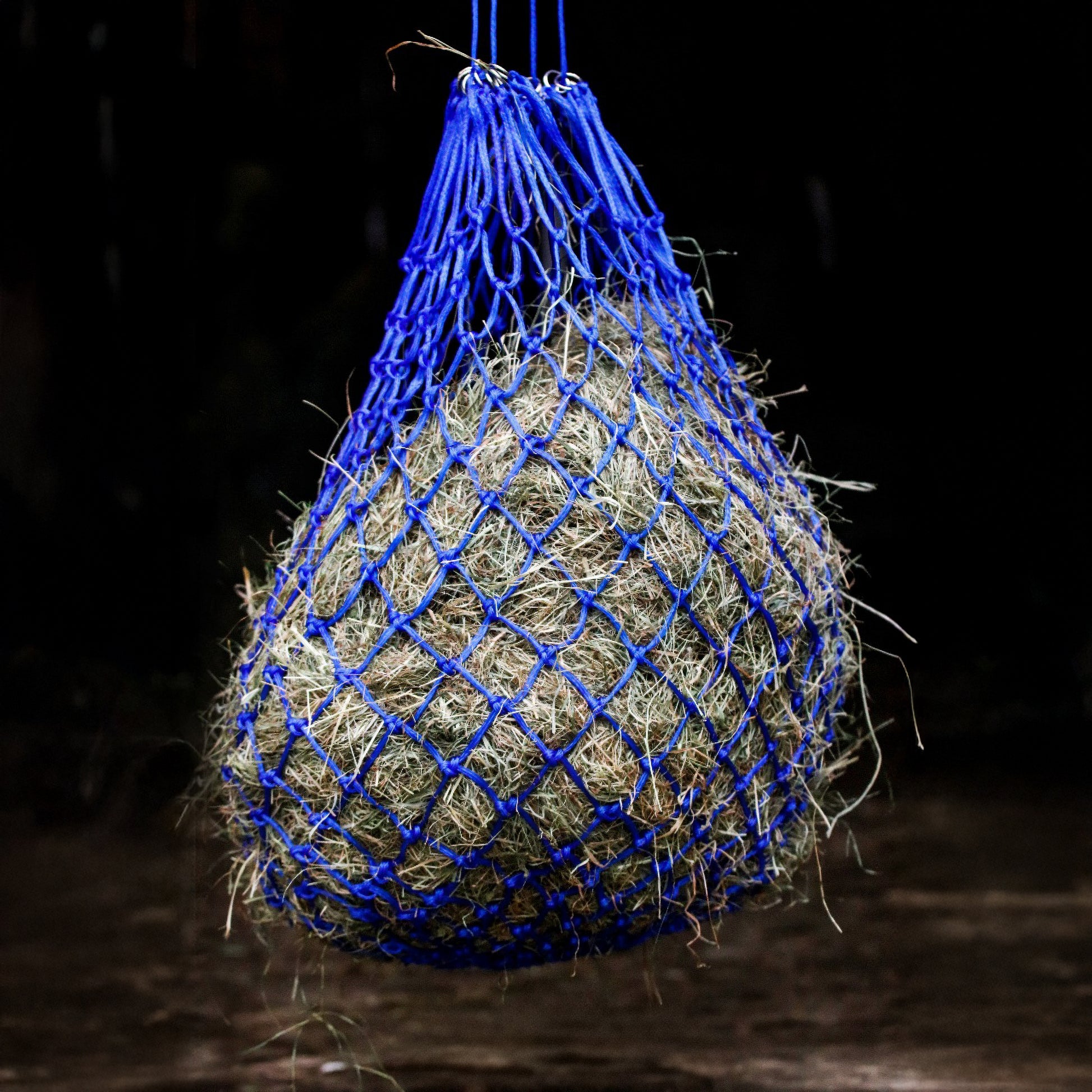 Engmaschiges Heunetz mit Aufhängeringen. In verschiedenen Farben erhältlich. Maschenweite 5 x 5 cm.
