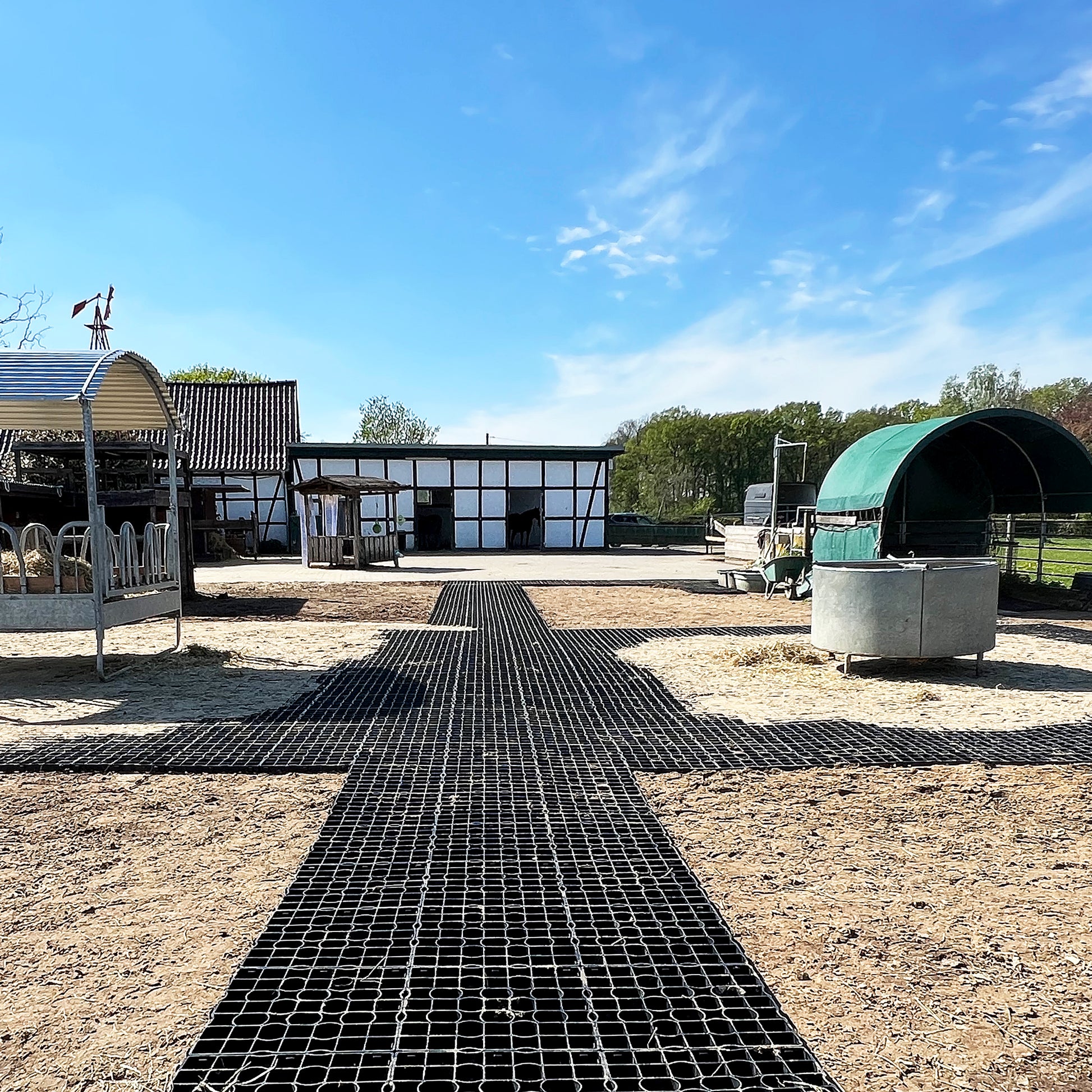 Eine Tretschicht/Sandauflage von mindestens 3cm ist auf den Spidergridmatten grundsätzlich nötig. Falls der Matschboden extrem weich, fast wässrig ist, sollten zusätzliche Maßnahmen getroffen werden.
