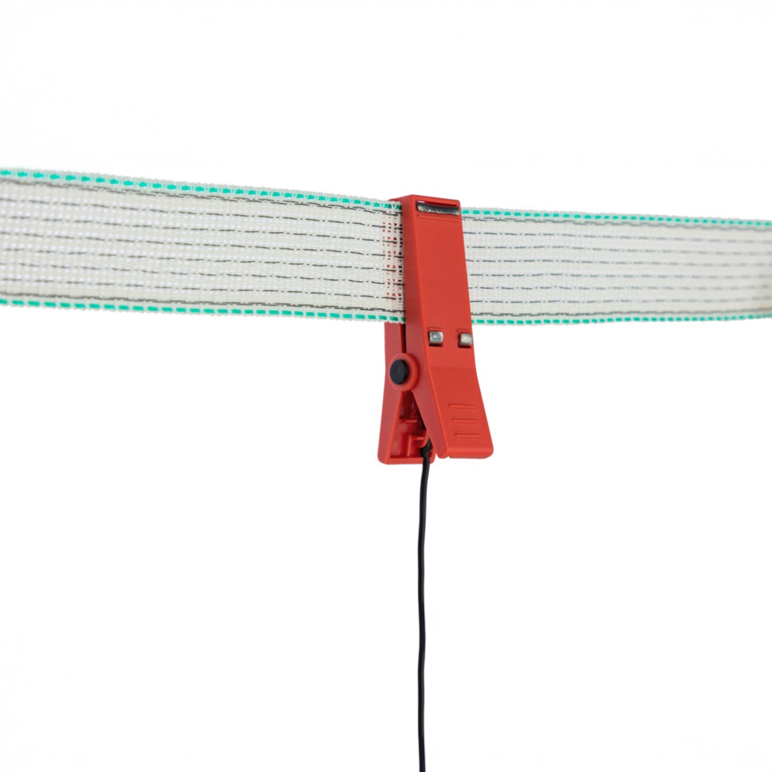 - mit 2 Krokodilklemmen für die Elektrifizierung von 2-reihigen Zaunanlagen mit 40 mm Weidezaunbändern